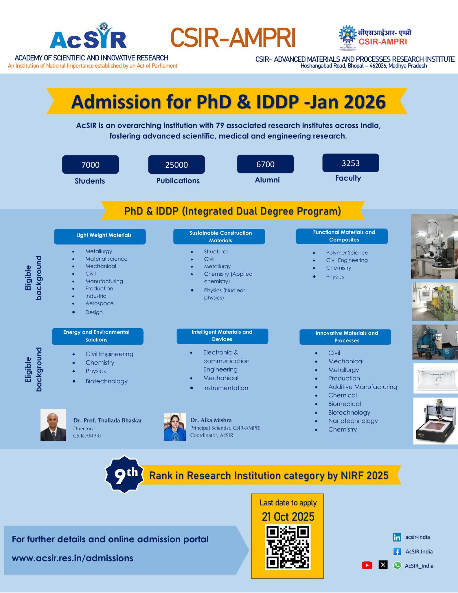 Welcome to CSIR-Advanced Materials and Processes Research Institute (CSIR-AMPRI), a premier research institute under the Council of Scientific and Industrial Research (CSIR), dedicated to pioneering work in advanced materials and process technologies.